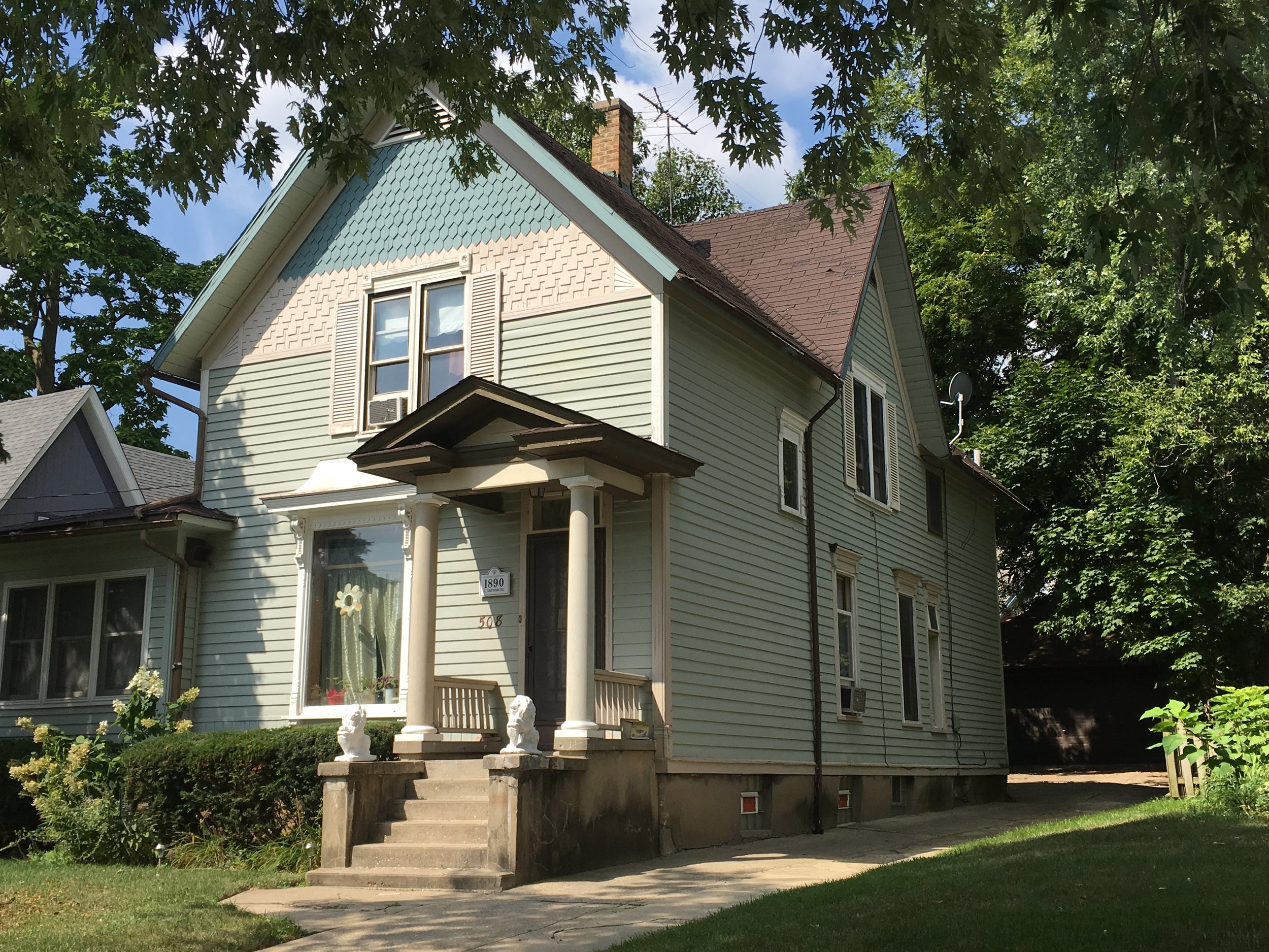 508 Ashland Avenue was built in 1890 for Charles Smithberg for $1,500. The home was built by Gust Anderson Builders. Smithberg immigrated to Elgin from Sweden to work at the Elgin National Watch Company as a jeweler. He and his first wife, Augusta Gustavson, had two children, Fred and Ed, however, their third child and Augusta passed away during child birth in 1893. Charles remarried Matilda (Tillie) in 1897 and also had two children, Albin and Helen. By 1915, Charles was no longer working at the Elgin National Watch Company but at a Jewelry shop in St. Charles. His son, Albin, also worked with Charles at that time. As a wedding present to their son Albin, Charles and Tillie built 517 Ashland Avenue for Albin's second wife, Anna. In 1928, Charles passed away at the age of 71 years old. Tillie continued to live at 508 Ashland with her daughter Helen and granddaughter, Vivian. Tillie passed away in 1938 leaving her daughter, Helen, the home. Helen converted the home into a two-flat, renting it until 1948 when it was sold to Sidney Wilson and his wife.